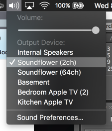 then hit the button with the gear icon bottom left and select "use this device for sound output" (you should still be hearing your iTunes output -- it is now going to both Soundflower and the built-in speakers)