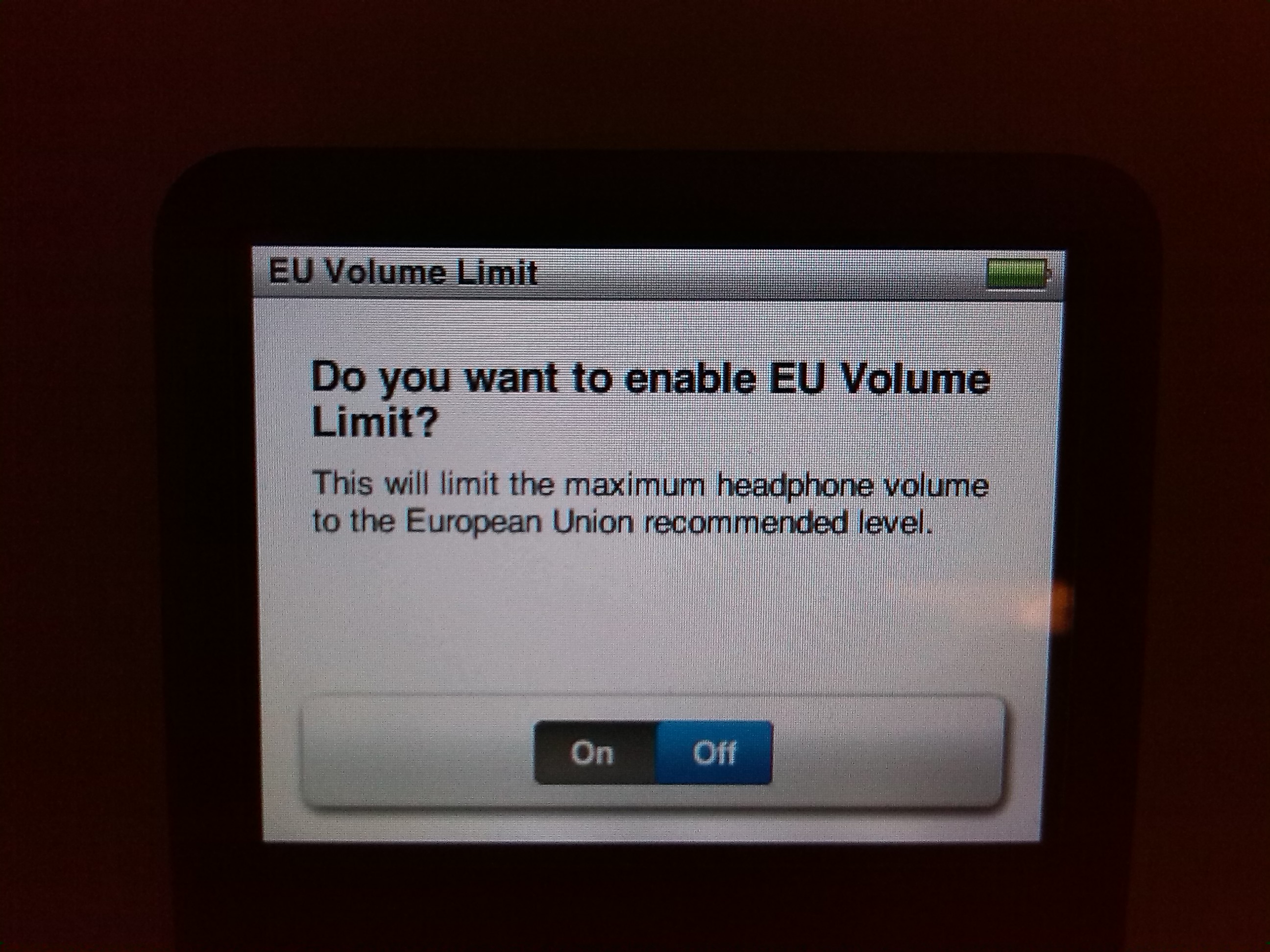 Can't say I'm too impressed by the actual on-screen text though. The question {do you want to enable EU Volume Limit?} is known as a "closed question". The only possible answers to a question like that are "yes" and "no" - but the choices shown on-screen are "on" and "off".