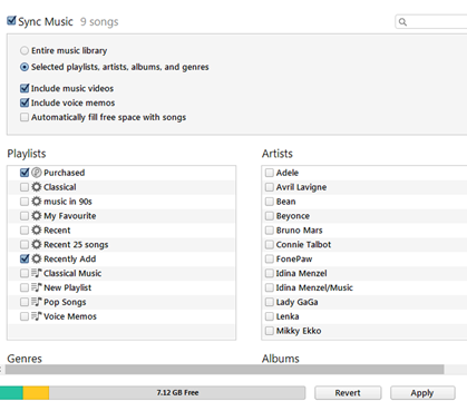 Then, tick "Sync Music" and filter some files. It is necessary to select "Selected Playlsit, artists, albums and genres" and "Include voice memos" .