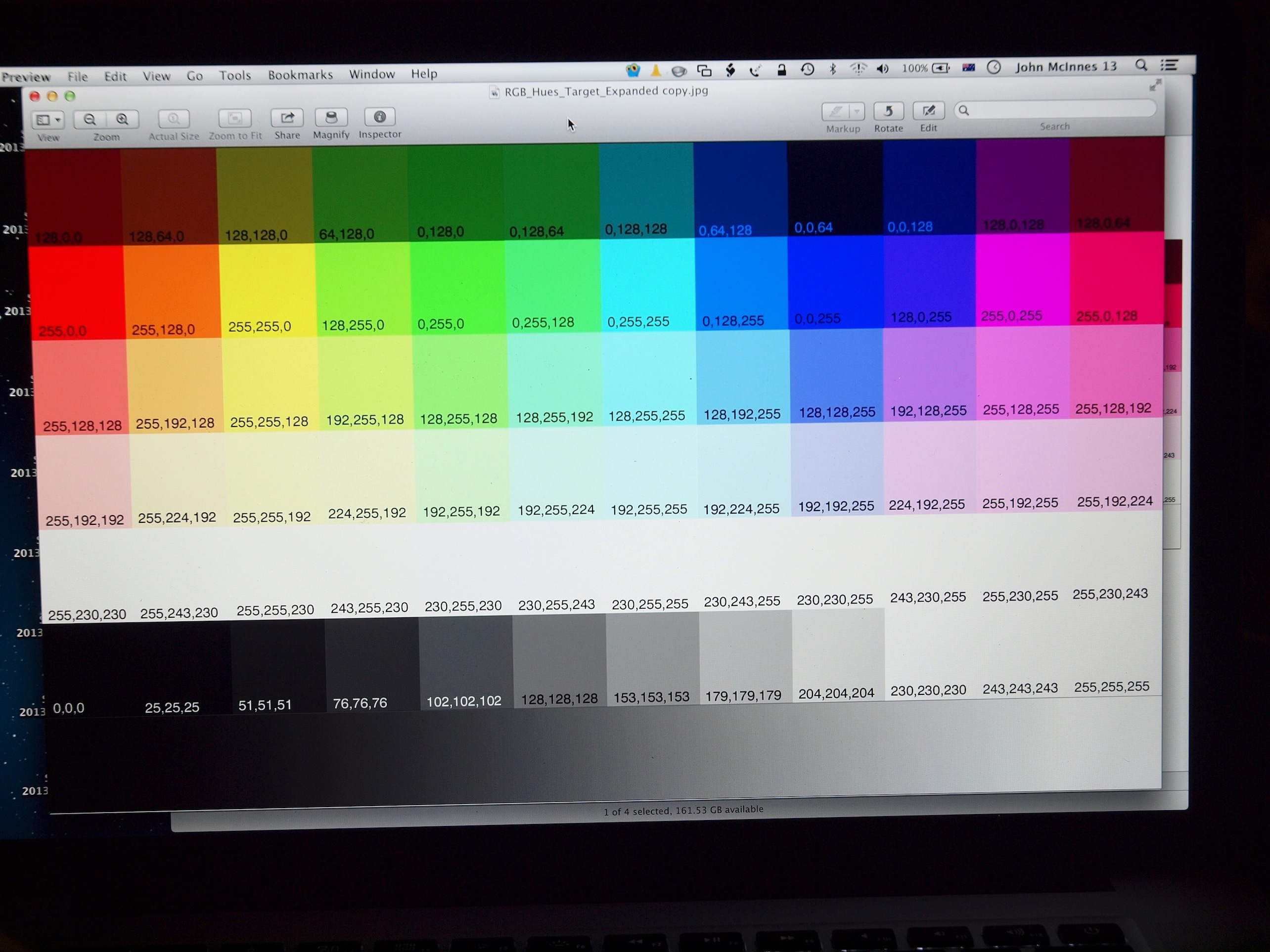Now here is where it got interesting. Some time after doing these various bits of playing around I noticed that the MBPR was showing the above checker satisfactorily on its own screen. I the re-did the Spyder 4 process and the resulting calibration is really quite good. I also looked at a white and a black colour checker, and shade 5 is distinguishable form 0, and 254 from 255, and no "pink makeup" effect.
