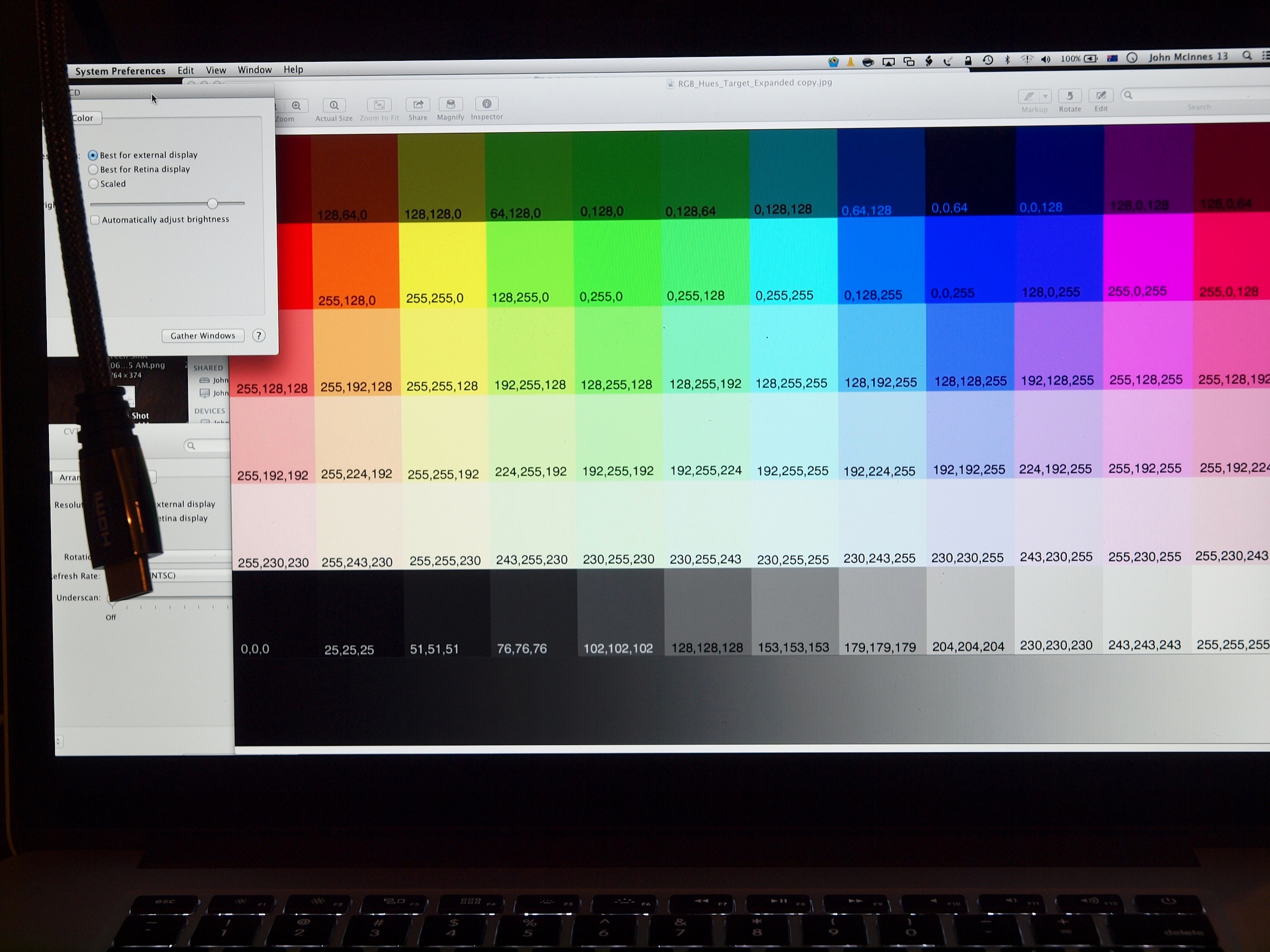 I also plugged the MBPR into my cheap LCD TV via HDMI. I created a profile for the TV using the Apple calibration tool again, and photos looked OK.