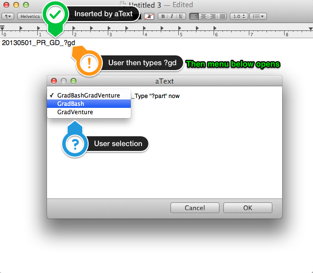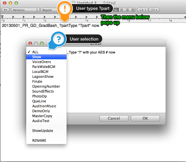 I've been trying to figure out a way to name a file in any application in the Save dialog but I want it to follow a specific format that uses multiple list menus based on input from other list menus
