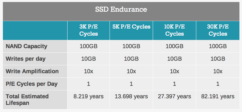 Ah I see. The top p/e cycles on that chart is what the drive is rated for. How do you determine what an ssd is rated for? (I take it 30k p/ drives are enterprise/server high end drives)