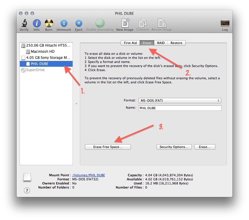 Csound1, all of the options are grayed out - both 'Erase' and 'Erase Free Space'. On all of the tabs the only option that is available is 'Verify Disk' and even that produces no further options. The current format is MS-DOS (FAT32).
