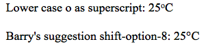 Shift Option 8 is correct for degree. Option zero is the masculine ordinal indicator. Best not to use it, as some fonts will put a line undernearth it.