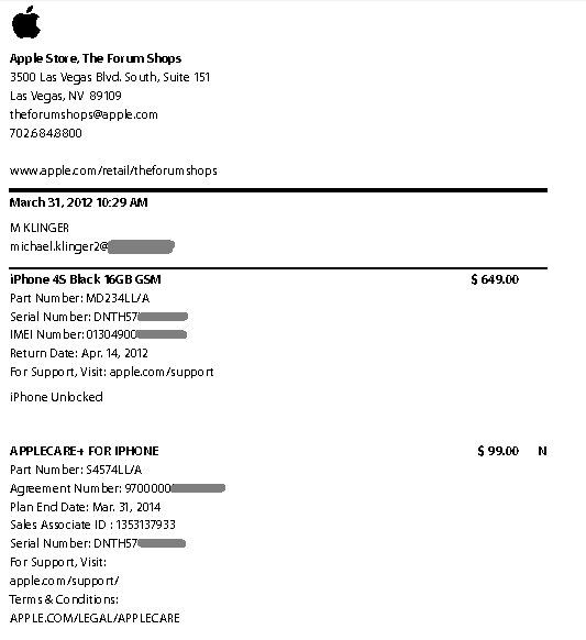 Last year in March I was on vacation in Las Vegas (I live in Austria/Europe) and bought a new unlocked iPhone 4S GSM in the Apple Store in the Forum Shops in Las Vegas including AppleCare+ (I just learned that iPhones can only be serviced in the Country where they are bought - my bad).