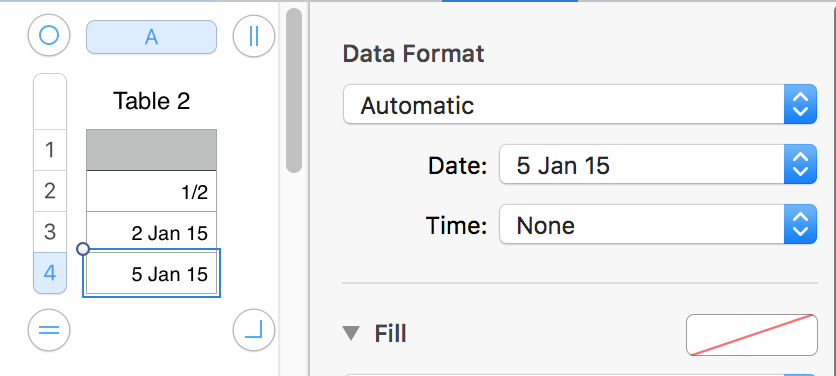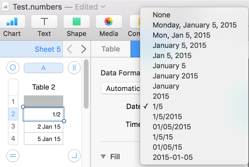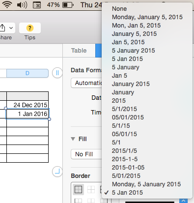 For example, if I type 24 dec 2015 or 1 jan 2016 (yes, lower case for the month works too 😉) Numbers converts them to D or DD MMM YYYY (see the ticked format at the bottom of this list: