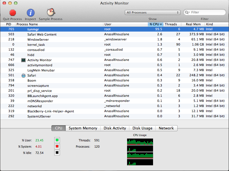 I checked out the Activity Manager of my computer and I instantly noticed that there's a process named "tunmgr" which takes 99.5% of my CPU percentage. I am always keeping an eye on the Activity Manager to quit it each time it appears.