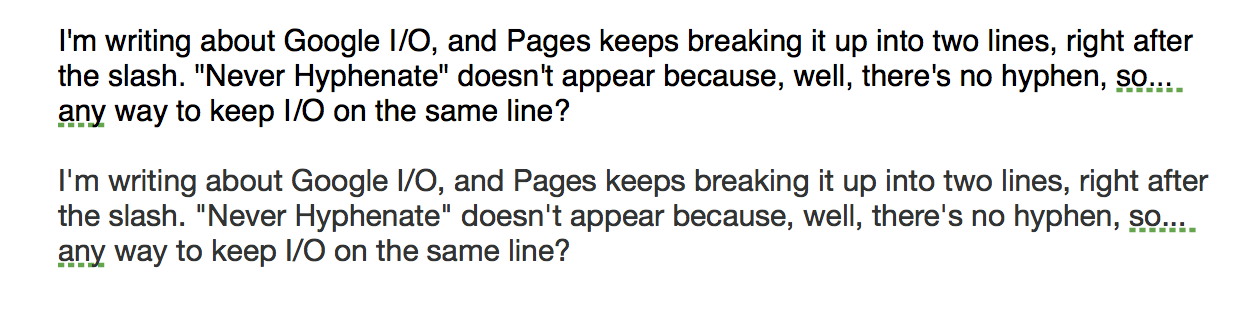 I'm writing about Google I/O, and Pages keeps breaking it up into two lines, right after the slash. "Never Hyphenate" doesn't appear because, well, there's no hyphen, so... any way to keep I/O on the same line?