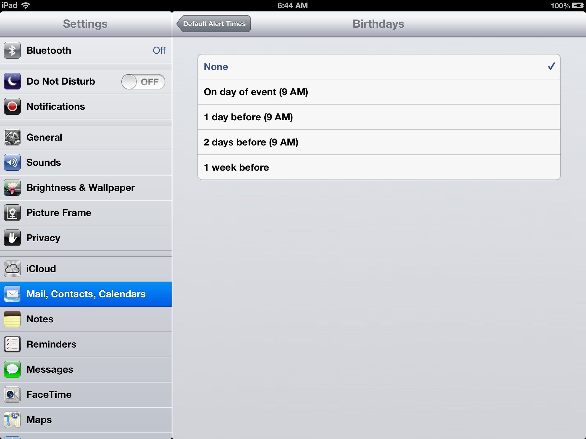 If you want to change the default time to None the path is Settings>Mail, contacts, calendars>Calendars>Default Alert Times>Birthdays or All Day Events.