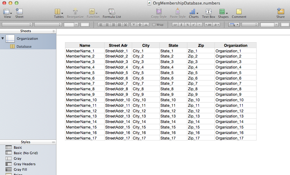 numbers spreadsheet with names, organization and addresses....for mailing labels.