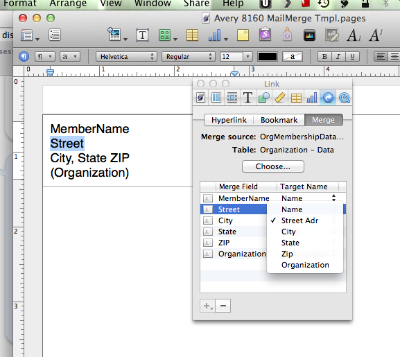 Pages merges data from both Numbers spreadsheets and Contacts/Addess Book.