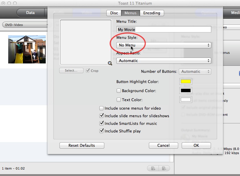 4. (My preferred method) Easy enough but needs 3rd party software: Roxio Toast lets you burn your iMovie to DVD without menu - just drag the iMovie project to the Toast Window and click burn. Disadvantage: you'll need to spend some extra $$ for the software. In Toast, you just drop the iMovie project on the Window and click Burn.
