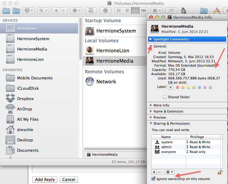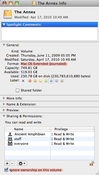"Ignore ownership on this volume" flag, to avoid permission problems when accessing the iPhoto library from different user accounts.
