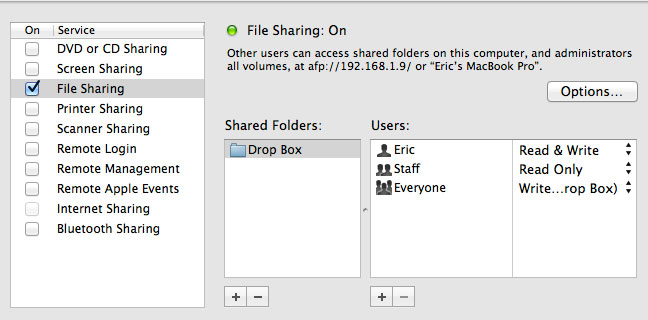 My file sharing is on and I have attached an image with the settings I am using. I have compared these settings to other macs in the office that have a working Drop Box folder and they match. Hope you guys can help me.