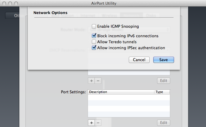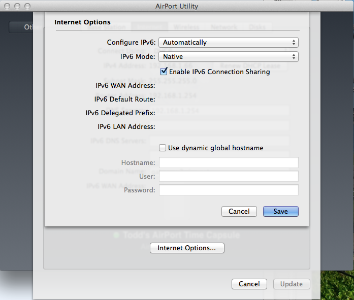 1) Changing the IPv6 settings on both the macbooks and the TC to 'Local Link Only'. This is appropriate given my ISP is not yet supporting IPv6.
