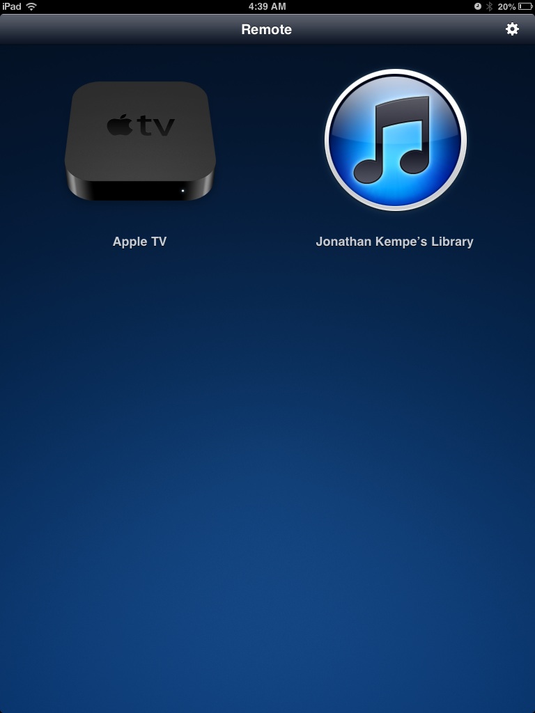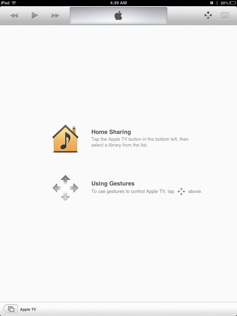 Now when I touch the apple tv icon I can't see my itunes library content to play on the apple tv. I see the below image. If I tap on the icon in the bottom left it takes me back to the screen in the first image. What is the strangest thing is that I can control the apple tv using the gestures interface! This isn't what I want though and I want to be able to see the itunes library on the screen of the ipad and play it on the apple tv. You can see in the video on this link (http://www.youtube.com/watch?v=UvEpgcE9KCs). This is what I am trying to do and I just don't understand why I don't get the screen seen at 1:25 in the video. Instead I get the screen seen in the below image. Any ideas? I know that the remote app is connecting to the apple TV because I can control it using gestures, just strange I can't see the content on the ipad like in the attached video clip, instead I see the screen in the image below. Any ideas would be greatly appreciated!
