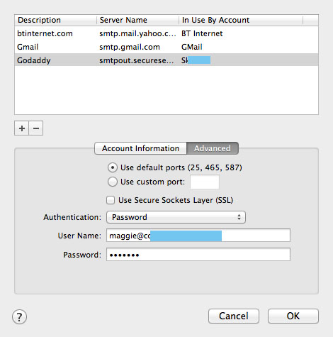 Can't get Godaddy outgoing server to work in Mail - OK in Outlook