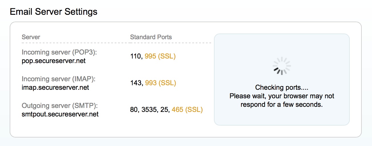 Tried smtpout.secureserver.net with and without SSL, and with all sorts of ports 80, 3535, etc.