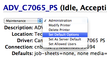 With the CUPS web page open, select the Printers tab and then select the printer you want to modify. Then from the Administration drop menu, change to "Set Default Options".
