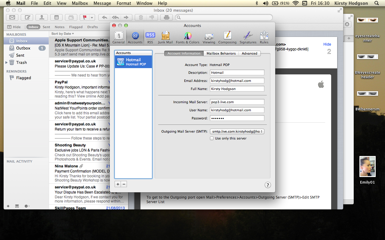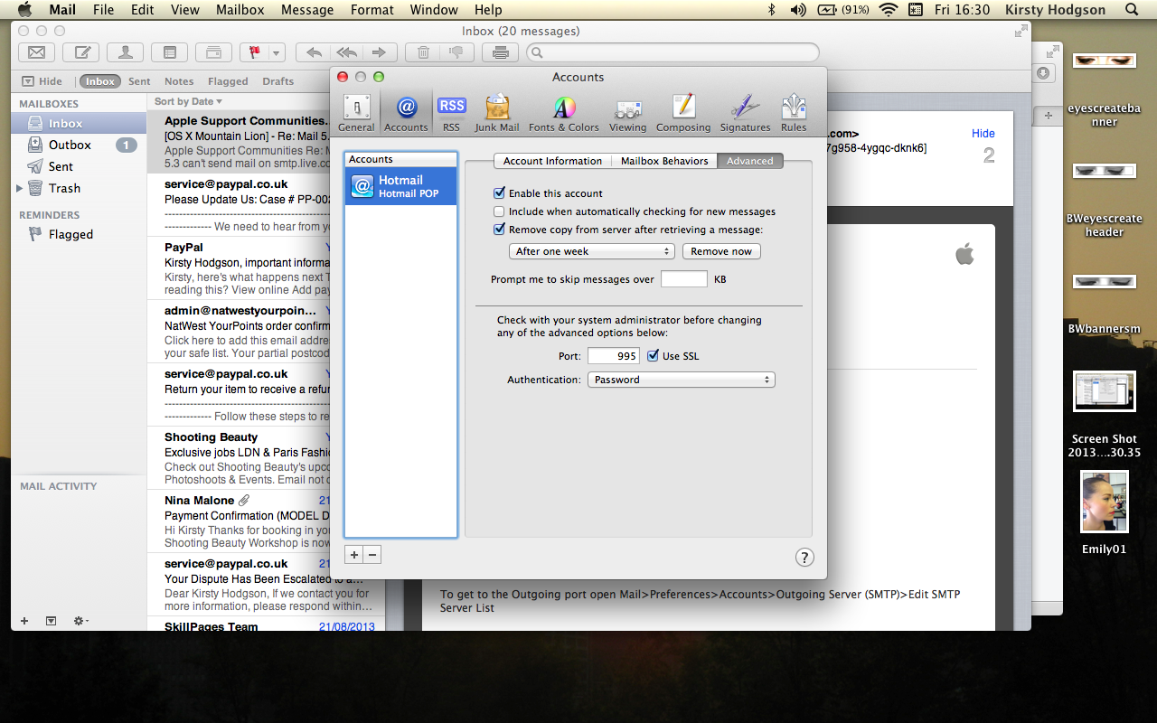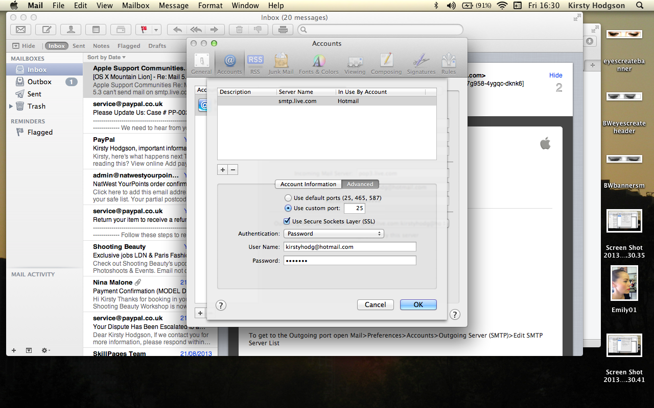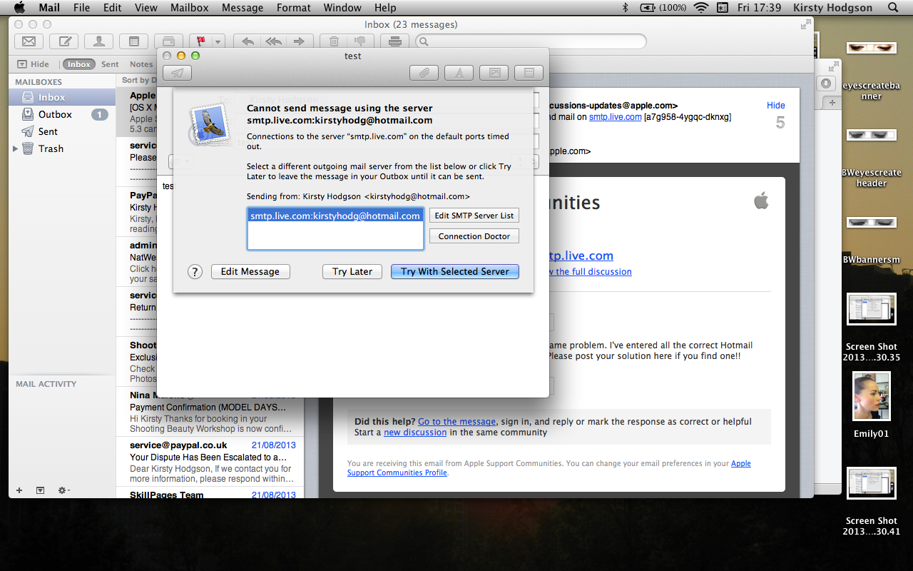 I can receieve mail and I can send messages from my iphone. My internet connection is fine and I'd really rather not pay £35 to fix it - it shouldn't break in the first place! I'm pretty much computer illiterate but I have followed things that have worked for other users such as turning SSL (?!) on/off; changing port numbers, using the connection doctor - Hotmail POP shows green light, SMTP continues to search/load. Nothing else in smtp list.