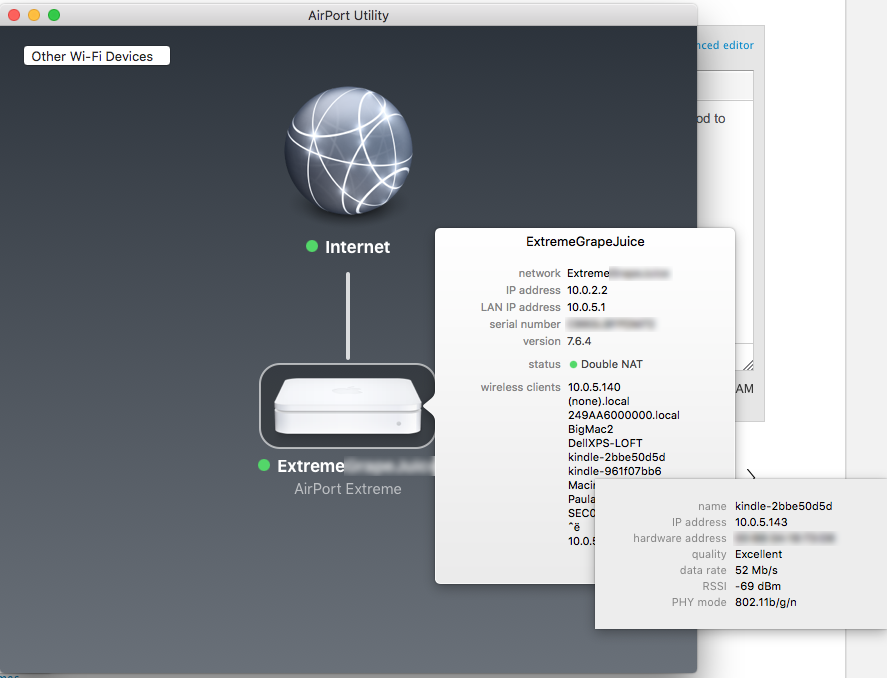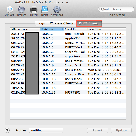 I just purchased a new Airport Extreme AC to replace my very trusty Cisco NAT. I'm trying to get better range (new job required re-configuration of tech items in house) and not as much buffer bloat/rebuffers while streaming video. (I have a very solid Verizon FiOS 50/25 connection). The one thing I'm not finding is a list of wired & wireless DHCP clients and their information.