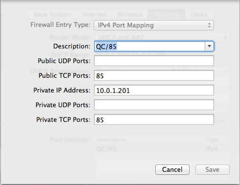 Here I've created a rule for port 85 - I'm assuming it's using TCP, but if it's using UDP just add the port values into the UDP fields instead (or in addition to). Also set the IP address to your camera's address (which probably isn't 10.0.1.201 as above).