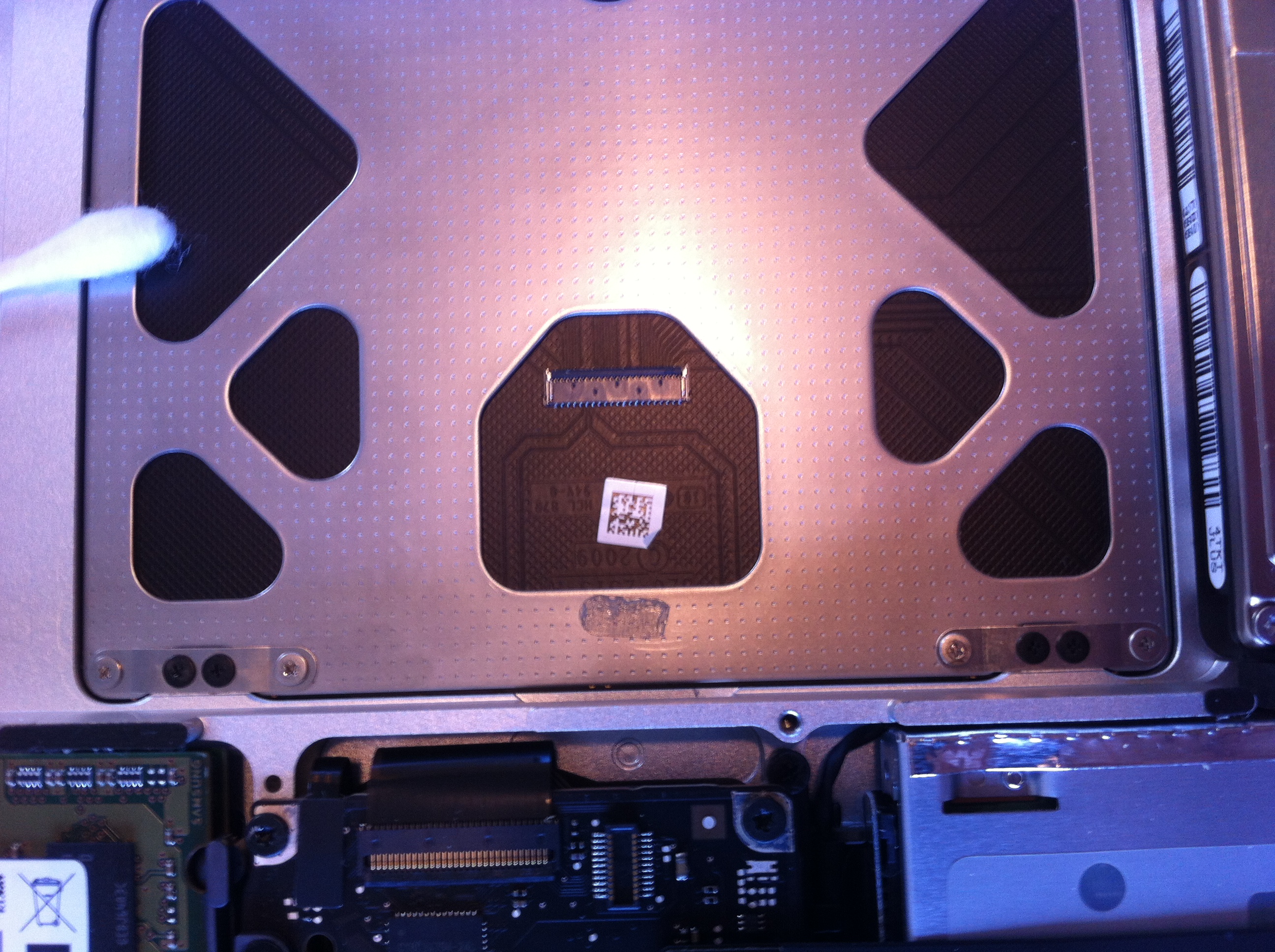 Attached: The underside of the trackpad with the user side of the computer up, trackpad ribbon cable removed.