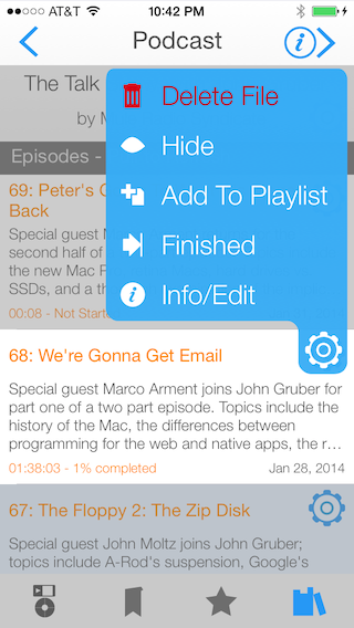 Here's a screenshot of the menu for re-ordering parts and switching between podcast and audiobook modes: