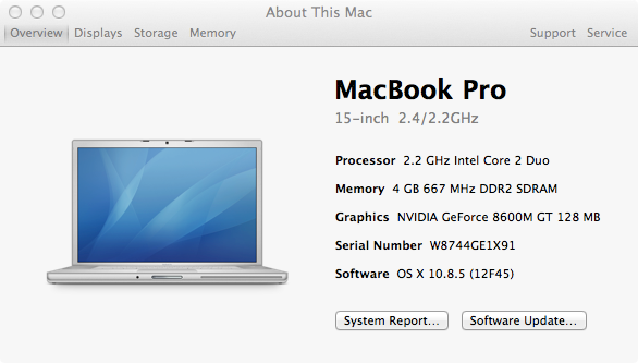 MacBook Pro, OS X Mountain Lion (10.8.4), 2007 MacBook Pro 15'' 3,1 Intel Cor