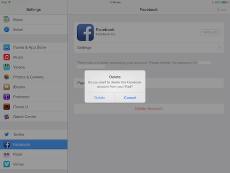 I quickly found that FB wanted the password for my account, and ran into the same as above - settings, delete, won't delete, delete app, turn off ipad, reload app, and a pop up screen that wouldn't go away unless you pressed settings instead of cancel. etc etc,