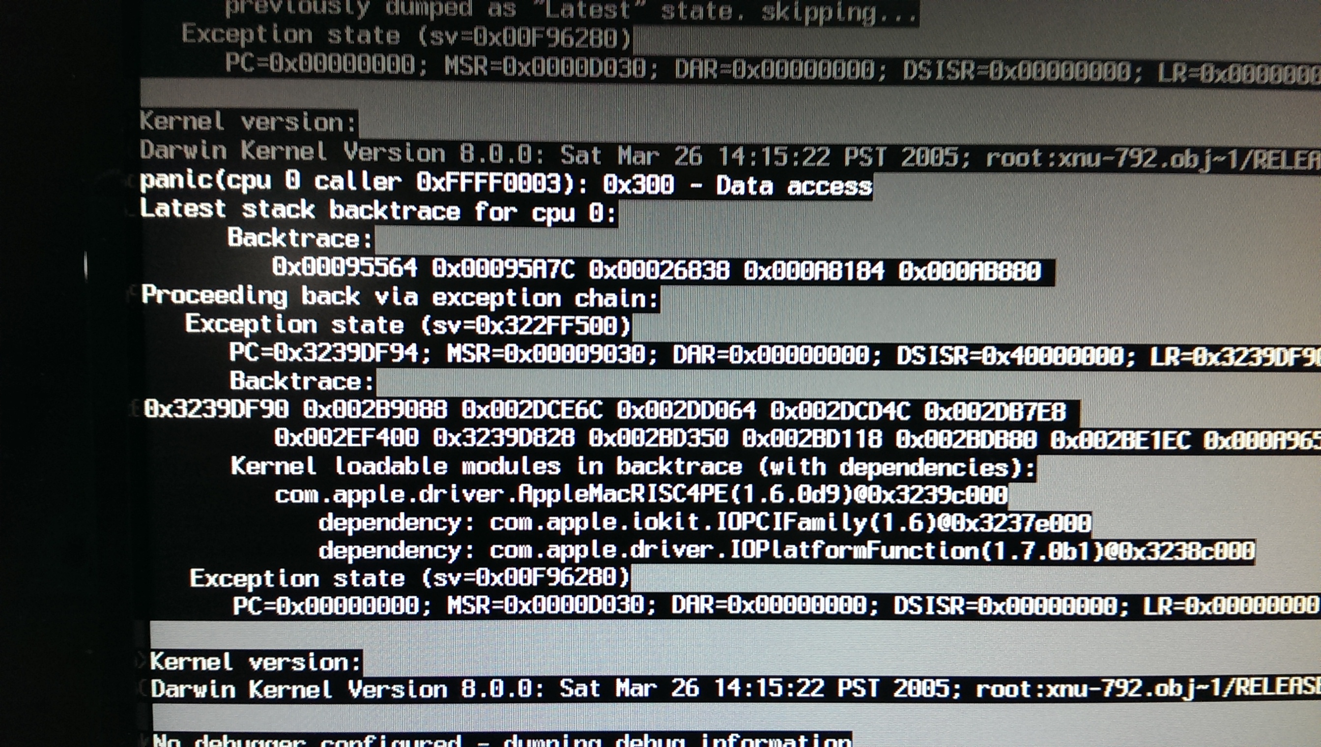 Booting off a Mac OS X Tiger (includes Xcode2) install DVD (2Z691-5305-A) (complete with original documentation) that I bought off eBay, the G5 has kernel crash with the following traces at startup: