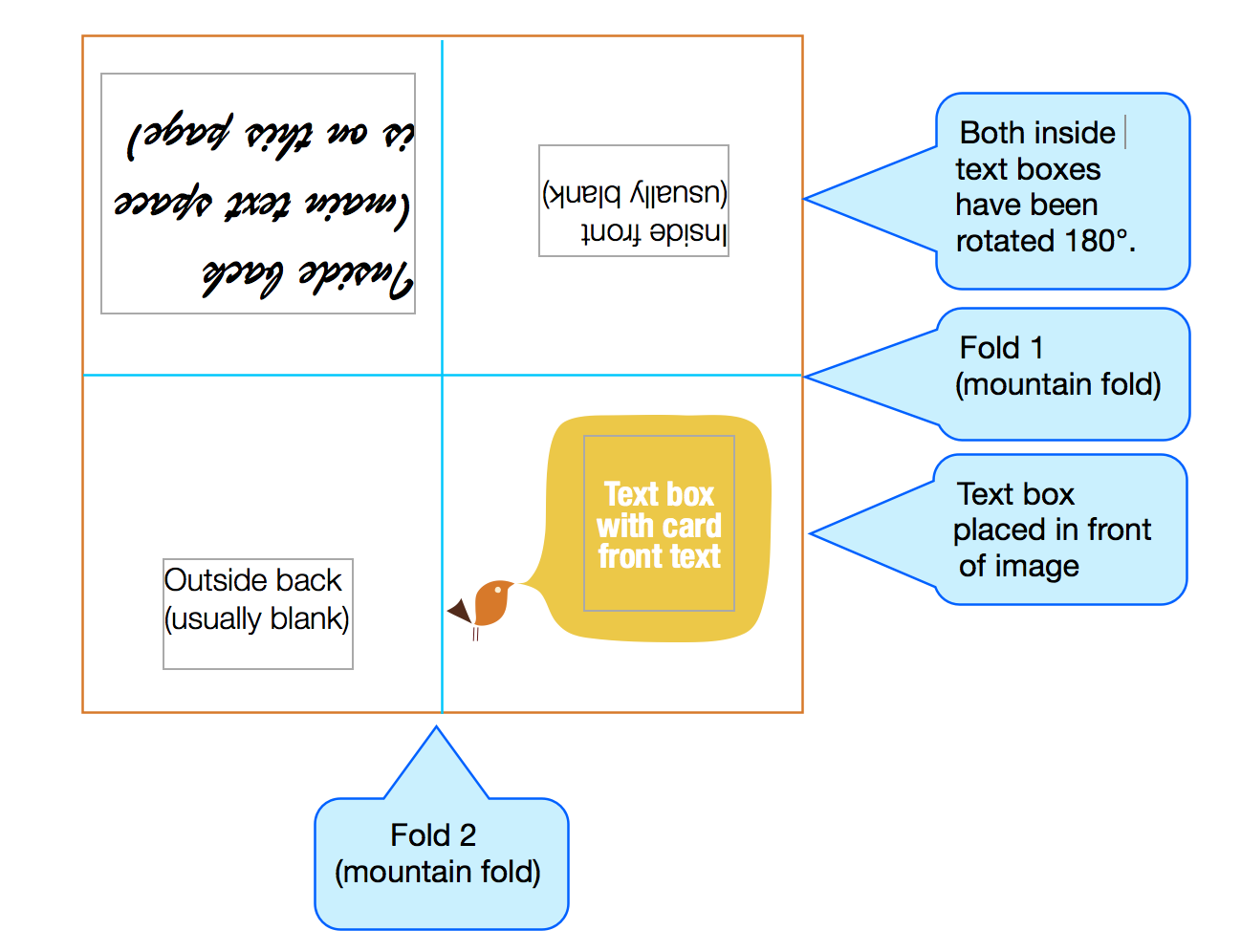 If you want to make a twice folded card, which prints a single card to a page, with all printing done in a single pass, then fod the page once horizontally and once vertically, you'll need to revise the template, using the instructions (and image) below.