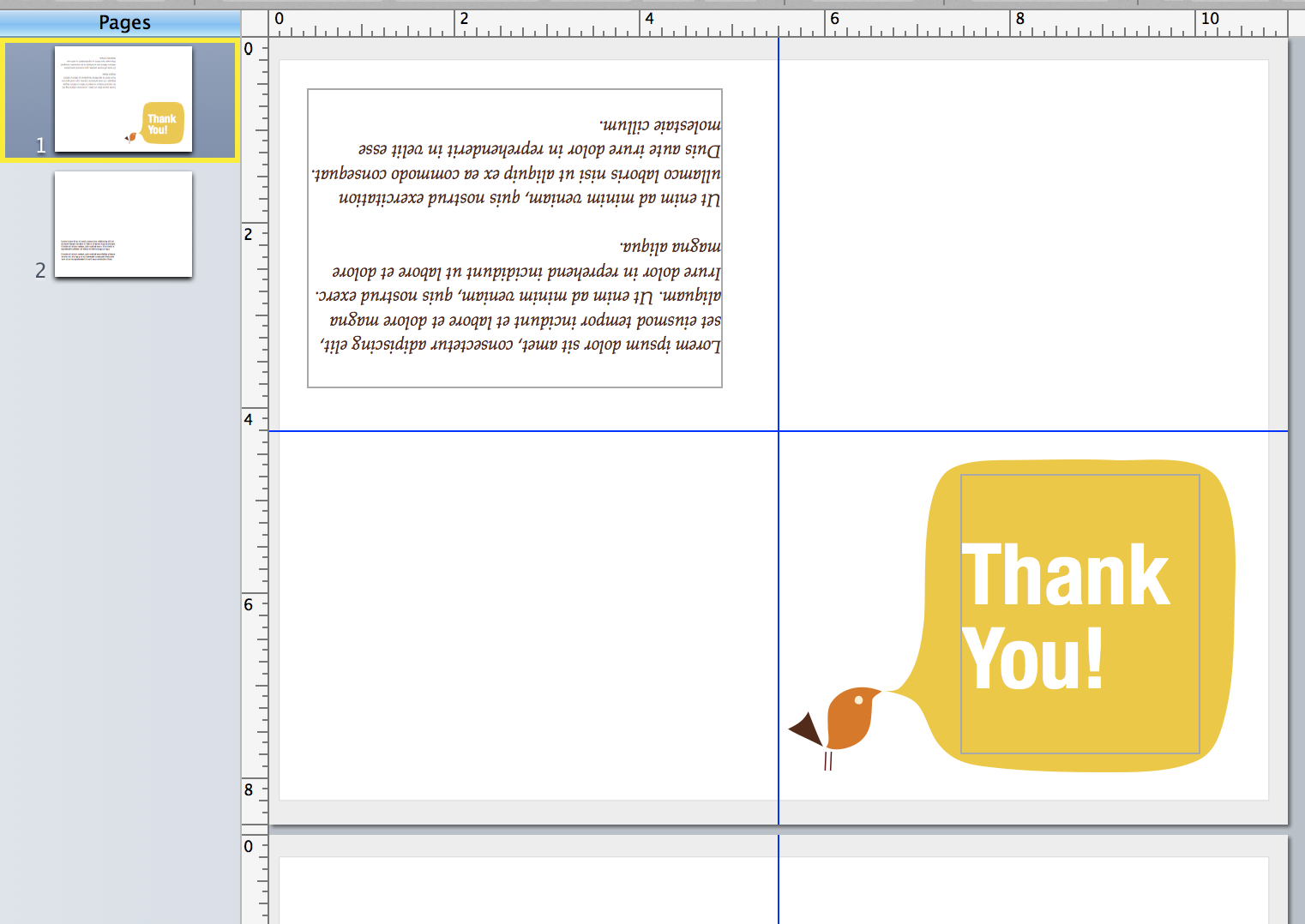 Using the single page shown as the template opens, the cards will have the bird and the words "Thank you" on the front of the card when folded. and a blank page on the inside.