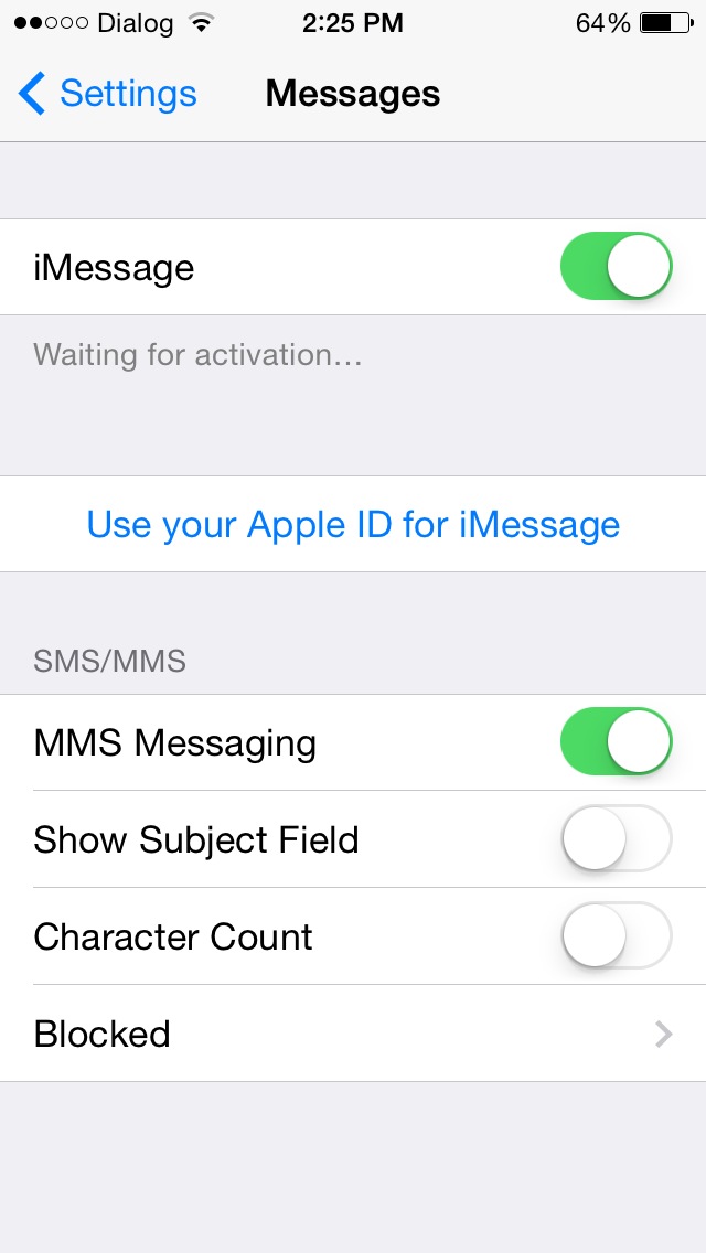 I believe i have found the fix regarding the IOS7 IMessage Waiting for activation issue.