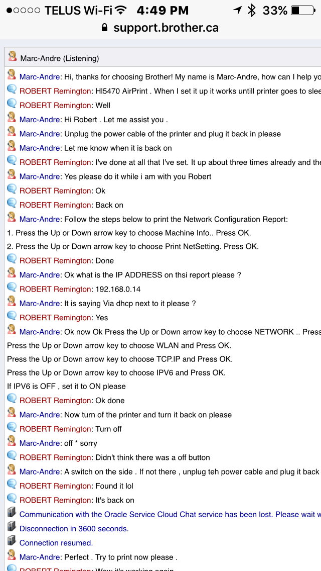 Given my experience with Brother support, doubt they will be helpful. (Last year, after 45+ minutes, help line person stated if printer could print test page from printer interface and WLAN report showed connection was OK, there was nothing wrong with printer and there was nothing Brother could do to help solve wireless printing issues.)