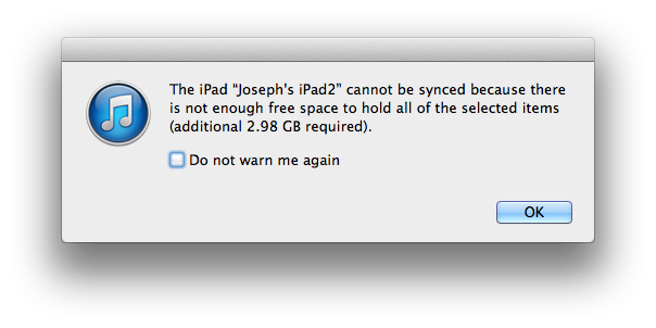 What is anoying is that iTunes thinks there is space avialable, until you try to sync.