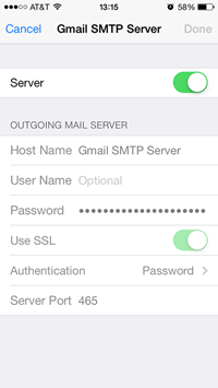 - In my phone, the Outgoing Mail Server is set as Gmail SMTP server. However, if I look into the details, I find that while the Server is on, all options including User Name etc. are greyed out, including the Done button.