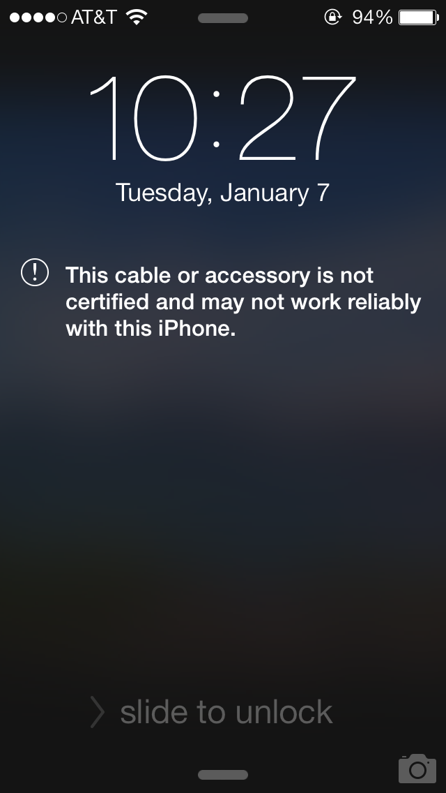 Sure enough I started getting this message incessantly. One day all was fine, and then boom, at least 50 times a day, seamingly at random with nothing plugged into the port. The only thing that changed on my phone was that I upgraded to IOS7 about a month prior. Otherwise, no obvious changes.