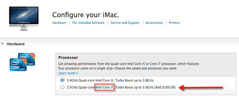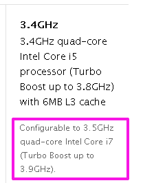 CPU: 3.5GHz Quad-core Intel Core i7, Turbo Boost up to 3.9GHz
