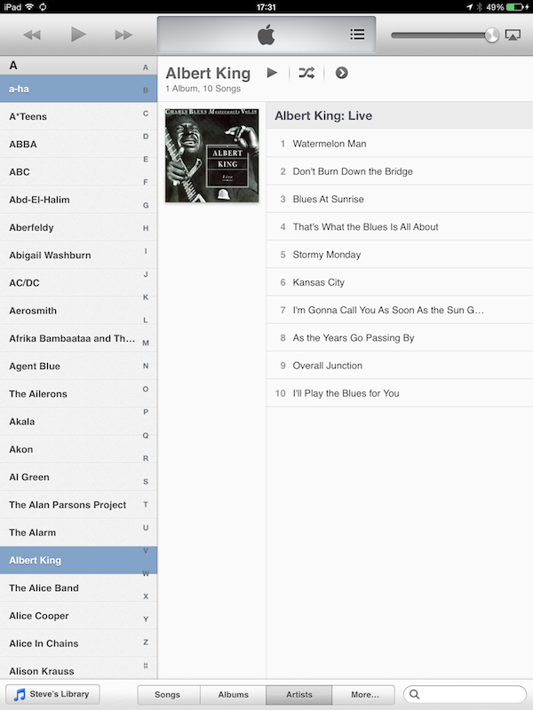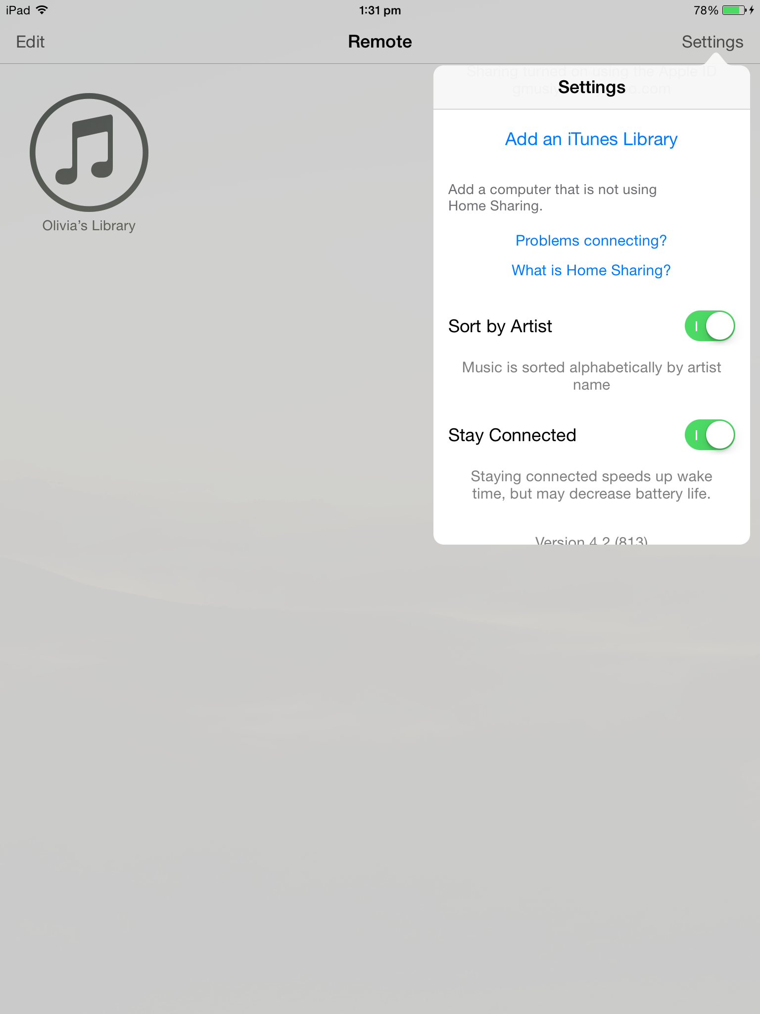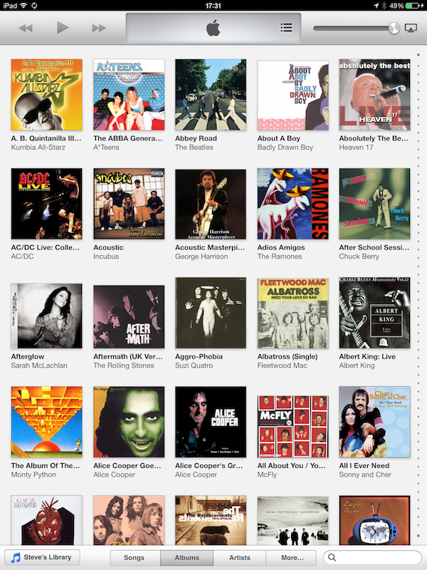 I use the Remote app on my iPad to control the streaming of my PC's iTunes music library to my stereo. I like the Album view because I can see most of the album covers. In iTunes 11.1 on my PC, album view displays the albums alphabetically by artist. i.e. all Beatles albums are listed before any Rolling Stones albums. But when viewing the same library on my iPad using the Remote app, the albums are listed alphabetically by album title, not by artist. So each artist's albums are scattered all over. I don't know about you, but when I'm looking for an album to play, I think about artists, not titles of albums. But there doesn't seem to be any way to change the way the Remote app orders albums. Am I missing something? Is there any way to configure the Remote app to display albums in artist order?