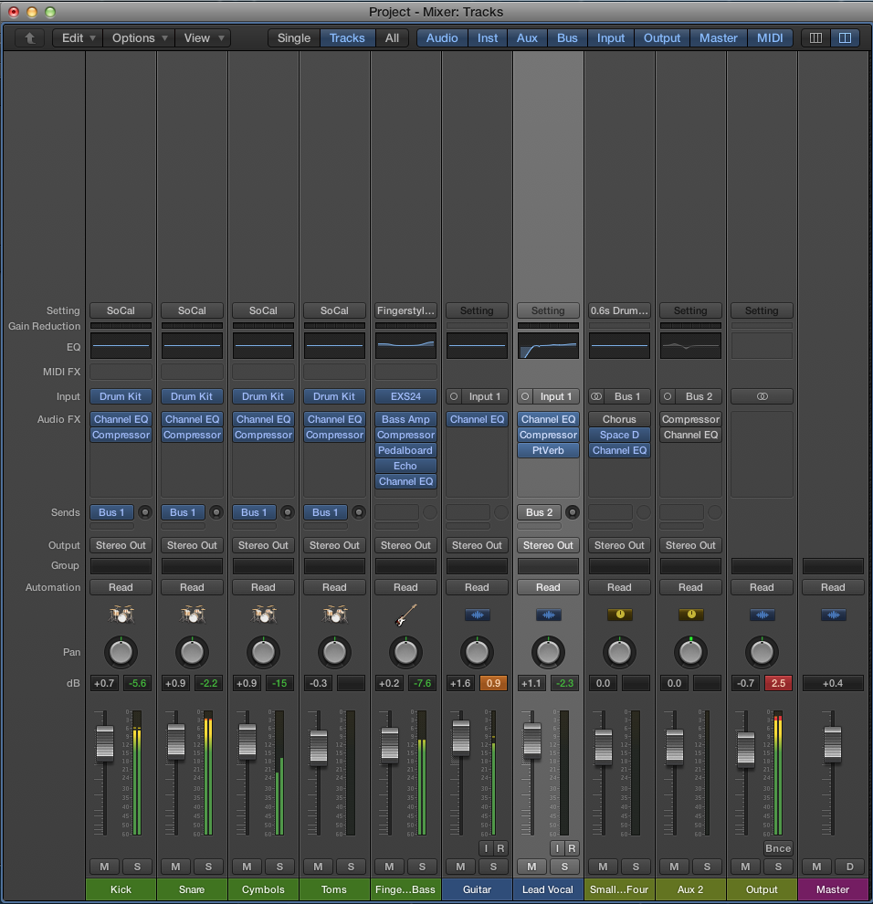 1. All your faders are upped too much, you should all drop 'm to at least -6 or -8 dB (consider that as the new "zero" line).