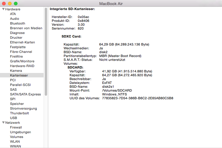Here's the thing: the SD Card (the slot, the device, the card, the folder, the drive, everything) just vanishes after the MBA wakes up from sleep. I've tried it with various cards with different filesystems (FAT32, NTFS, EXFAT) and capacities (32GB, 64GB, 128GB) -- always the same. I've reinstalled Windows 7 Pro x64 multiple times using up-to-date boot camp assistant and Apple Support Drivers.