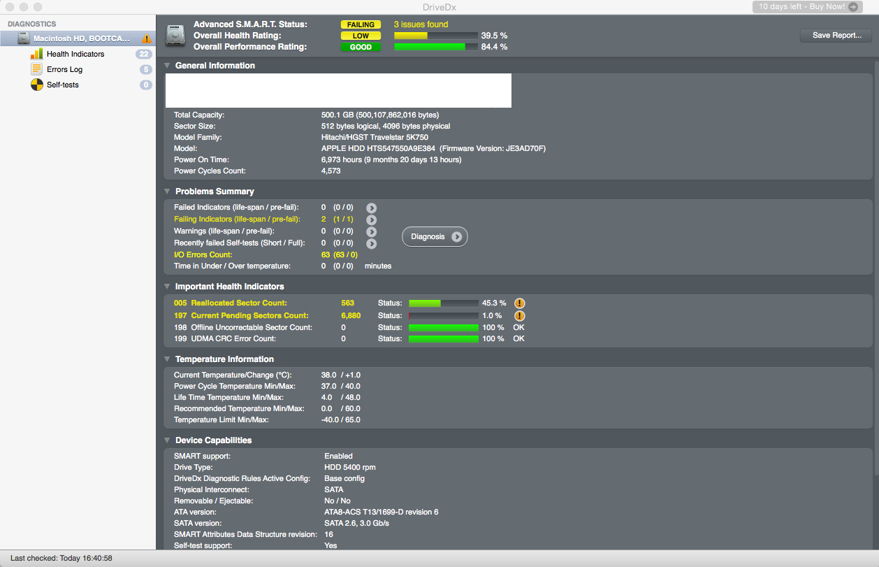5 Reallocated Sector Count 563 45.3% Failing