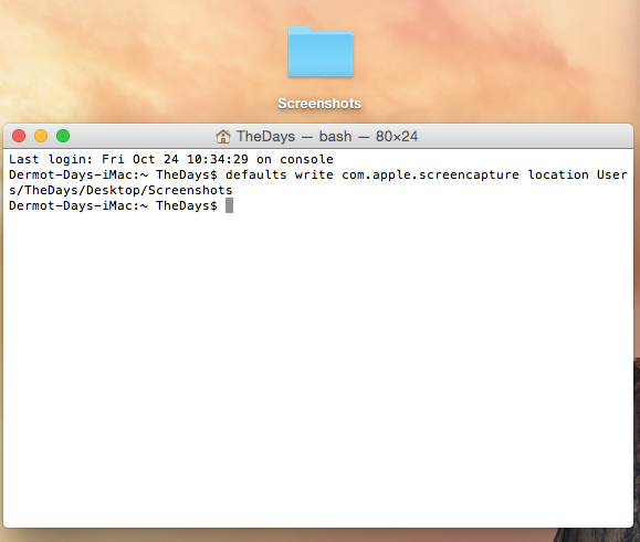 I want my screenshots to go to my desktop (where I can immediately see them). I've been trying suggestions I've found online - using Terminal to issue the following command: