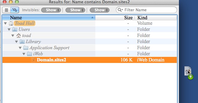 From the window of Find Any File, I dragged it into desktop and then copied it into a USB drive and then transfer and copied it into the location as suggested to the new mac. I then opened the iWeb application which I have previously copied from the old mac into the new mac. But it opened without my files and asking me to choose a template. I even restarted the mac but to no avail. One note, when I copied the file to the USB drive the file changed to just Domain, so I changed it back to Domain.sites2.