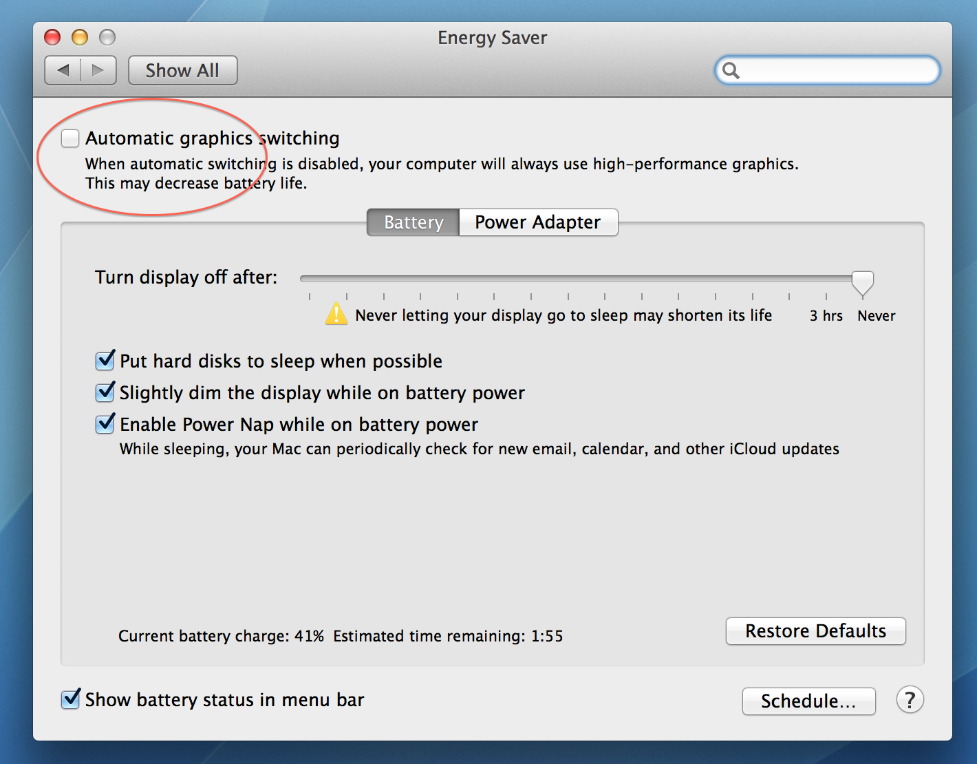 3. Switch off the 'Automatic Graphic Switching' option by going to: system preferences > power saver.