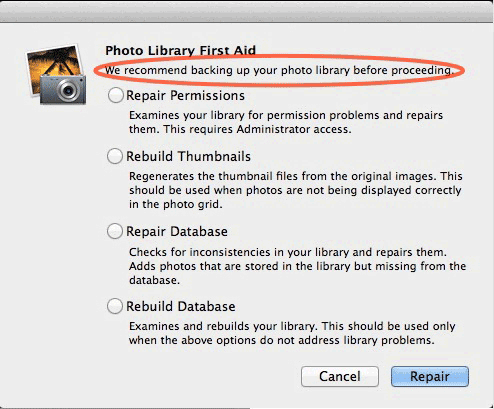 I then got the message “there is a problem with one or more of your files. Do you want iPhoto to repair permissions?