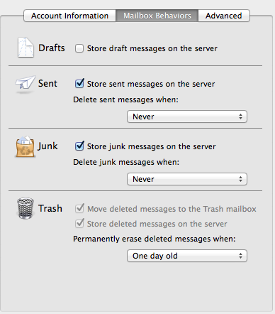 Remembering the fix for this issue is to uncheck the option under Mailbox Behaviors for "Store Draft Messages on the Server" (which then just stores drafts locally on the Mac and avoids the issue of lots of Draft messages ending up in your Trash folder) - I tried unchecking the box and then closing the dialog box - I was presented with a Are You Sure - Save / Cancel...I clicked Save. Went back into the Preferences and the option was still checked. Exiting and relaunching Mail has no effect to make the setting stick.