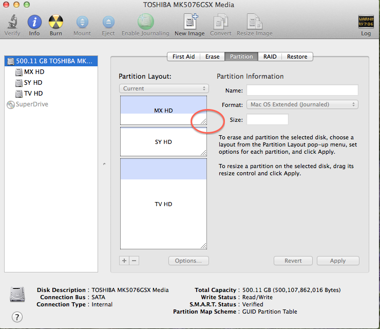 6) Now, create a time machine back up. I did this on the old partition of the external HD that, on its new partition, was currently running OS X. when I created that backup in time machine, it asks if you are sure you want to create a time machine back up on the same something (disk? volume? i can't remember) as your current start up disk. Usually probably a bad idea, but, here... it worked fine. So: you back up everything you have as a time machine back up on that other partition. this took about 7 hours.